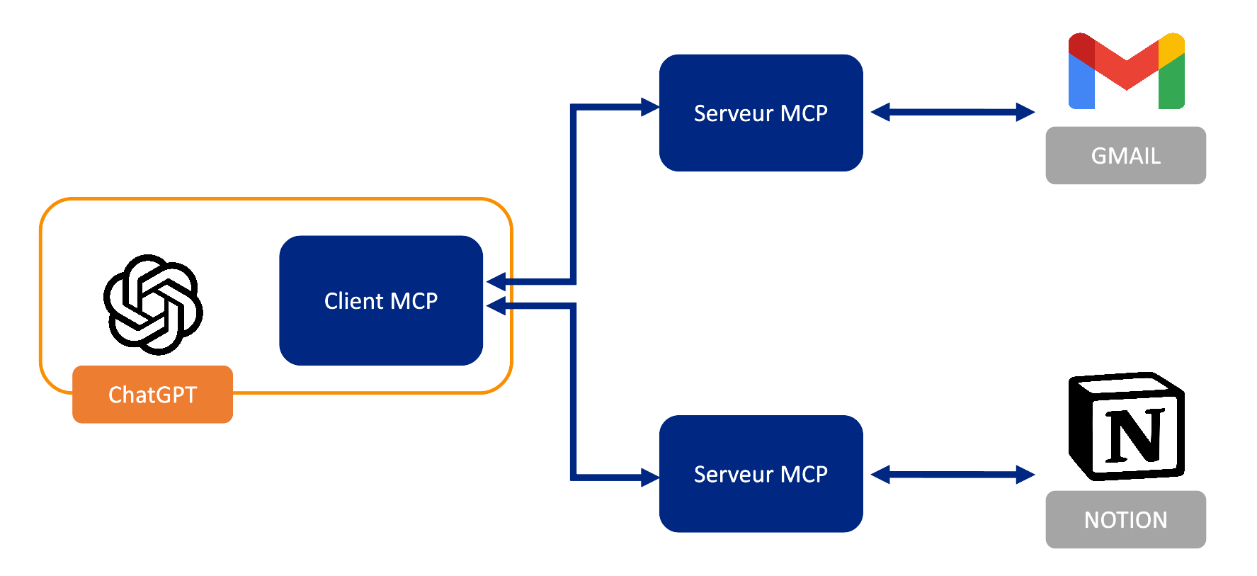 Schéma d’un protocole MCP à travers l’exemple de ChatGPT et de deux applications tierces (Gmail & Notion)